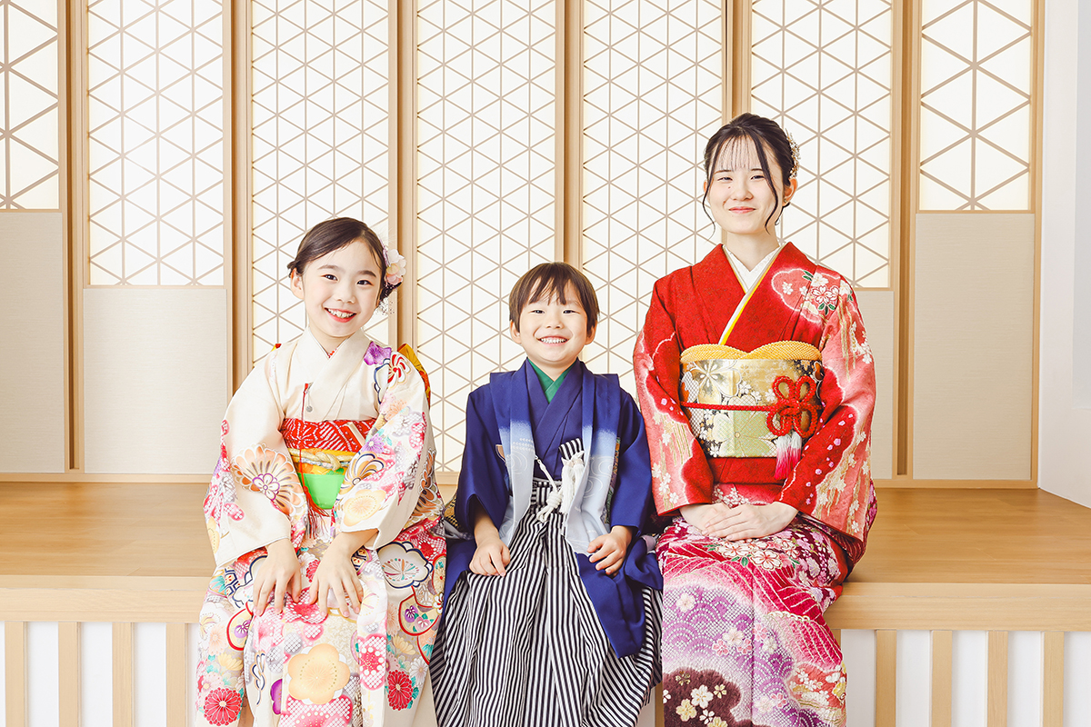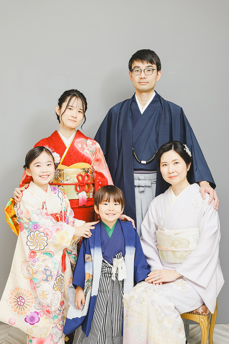 フォトスタジオでカメラマンにしてもらう撮影は、セルフタイマーとは一味違う、自然で温かい家族の姿を写真に収めることができます。お子さまの晴れ着姿だけでなく、ご家族そろっての集合写真もぜひ残しておきましょう。