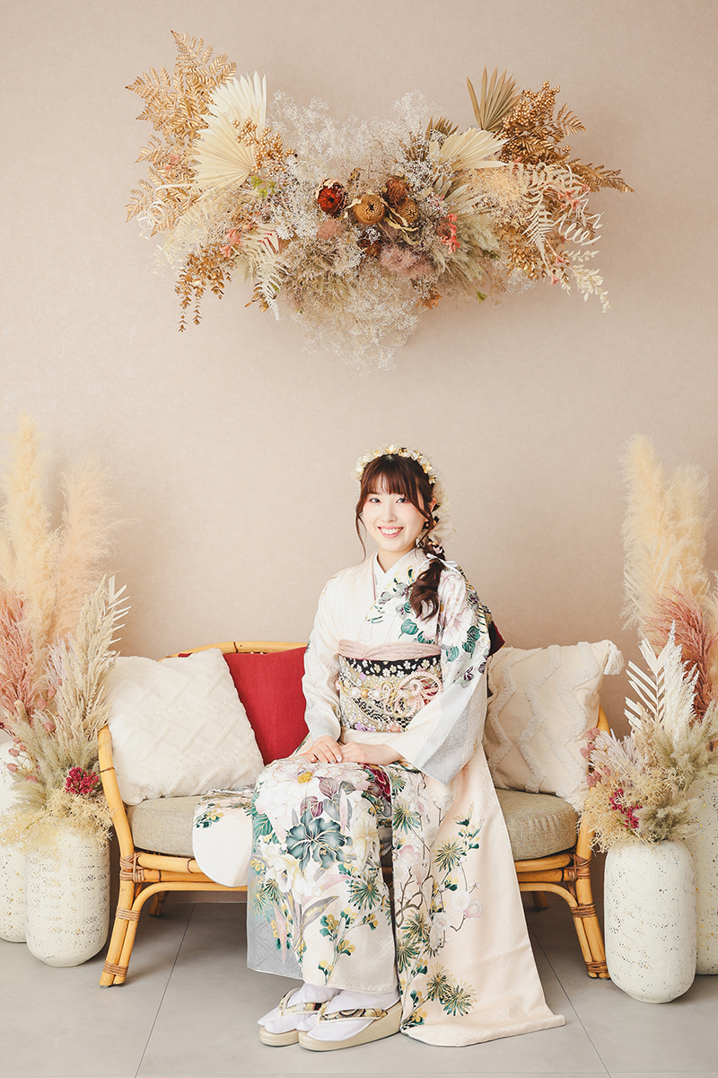 くすみカラーの振袖に合わせやすく、ナチュラルでアンティークな雰囲気に。