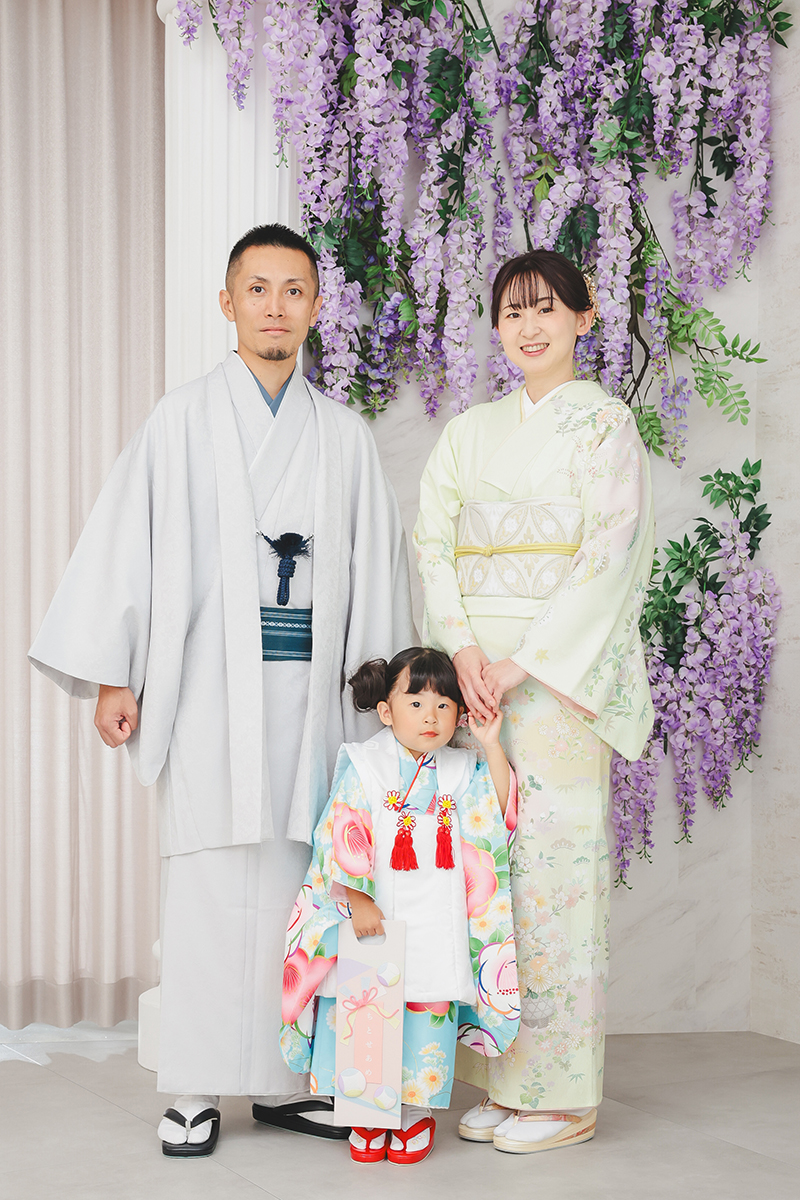 一体感と「特別感」が段違い 全員が着物で並ぶと、写真の格調高さが一気に上がります。 「家族みんなで、この子のお祝いをしているんだ」という温かい絆が、写真全体から伝わってくるのです。 お子様にとっても、「パパとママも私と一緒の格好をしてくれた!」という喜びは、記憶に強く残ります。
