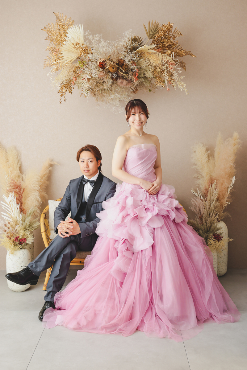 ウェデイングドレスが「永遠」や「誓い」を象徴するなら、カラードレスは「個性」や「今の自分らしさ」を最大限に引き出しスタジオの空間そのものを塗り替えてくれる衣装です。