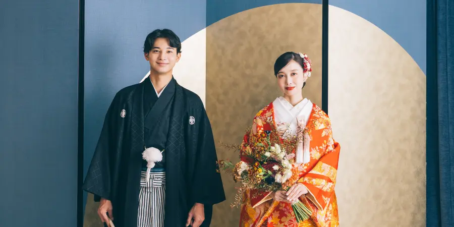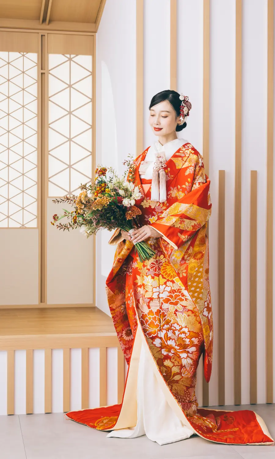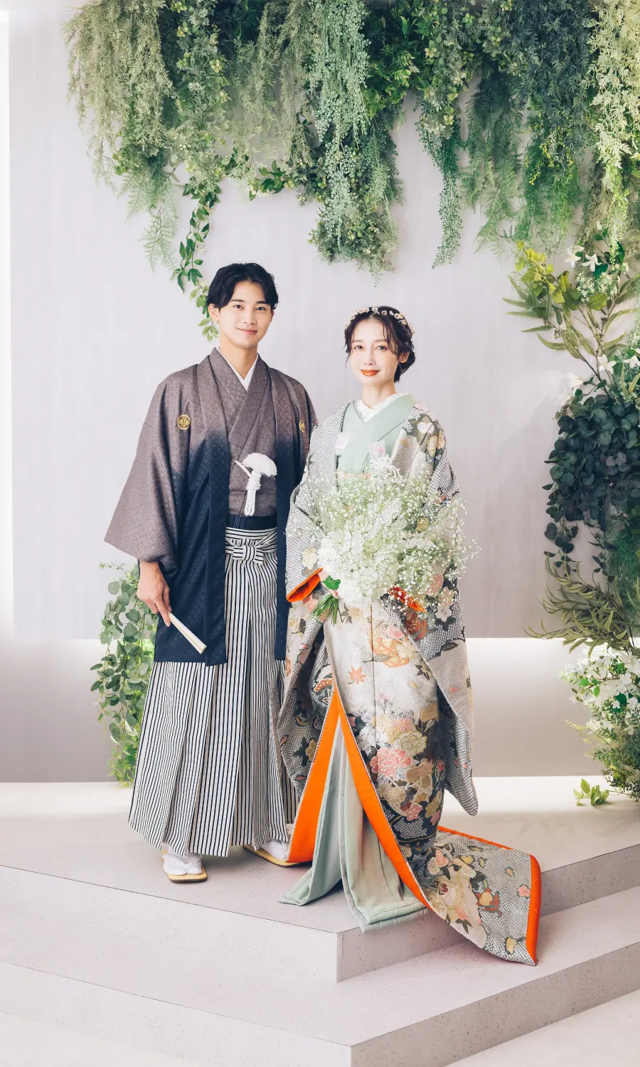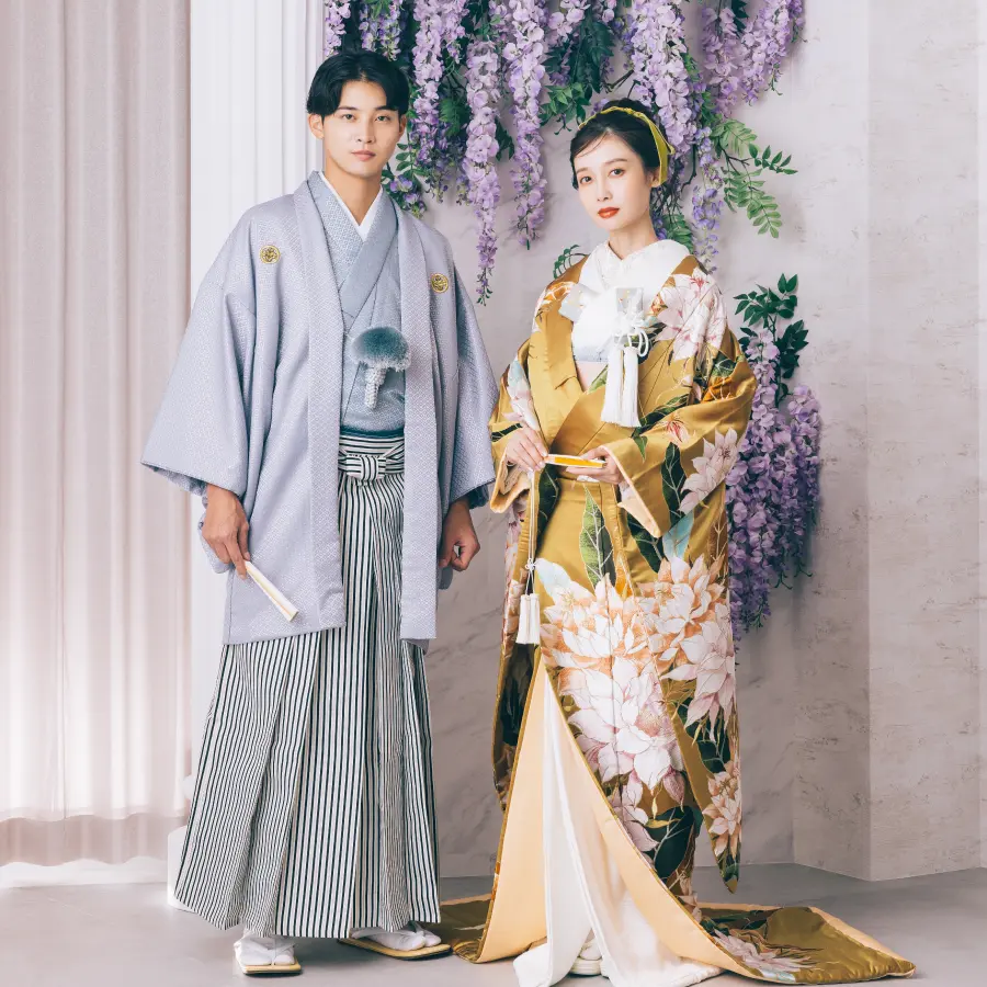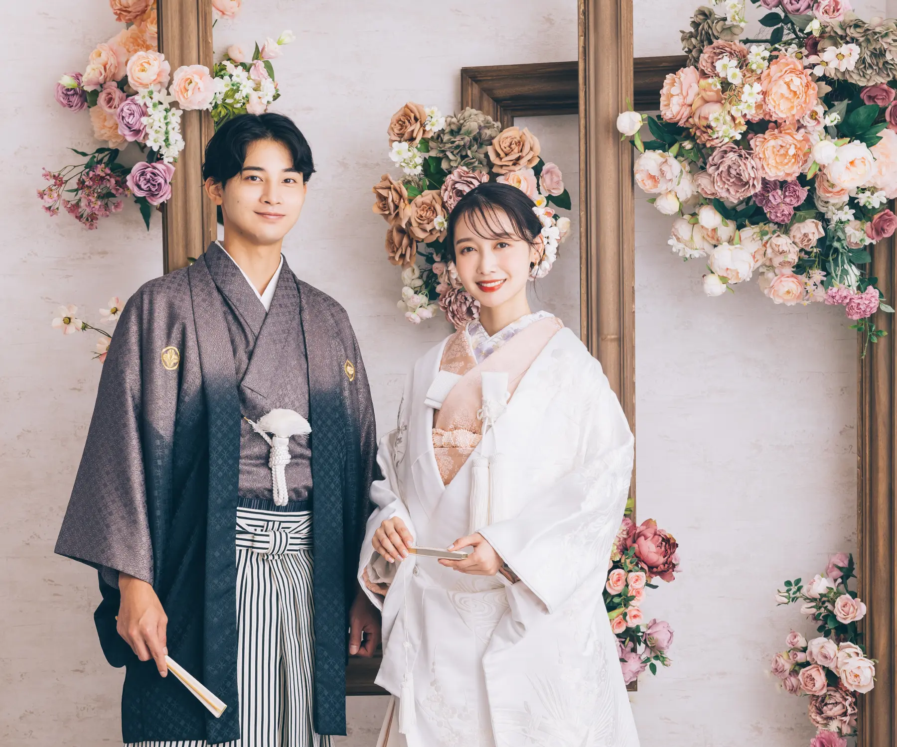 新婦は白無垢・色打掛・引き振袖、新郎は紋付袴を豊富な色柄の中から選べます。