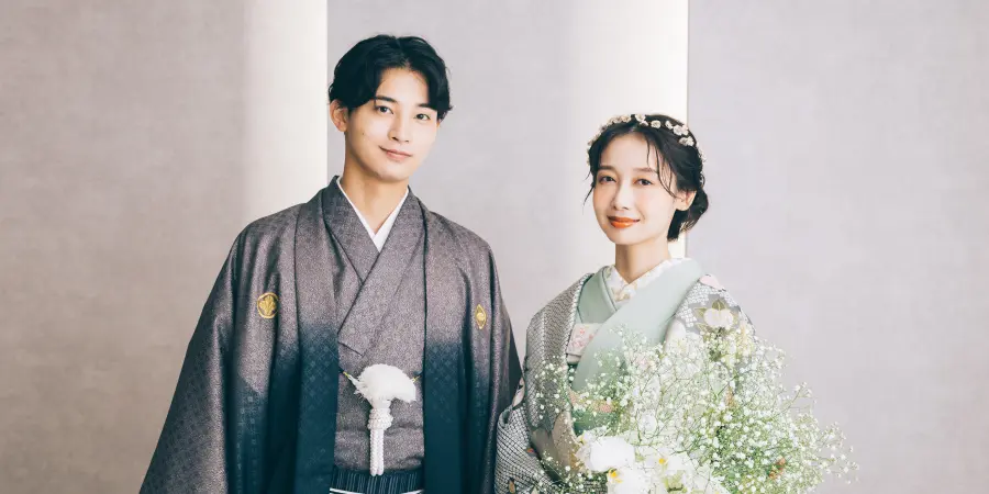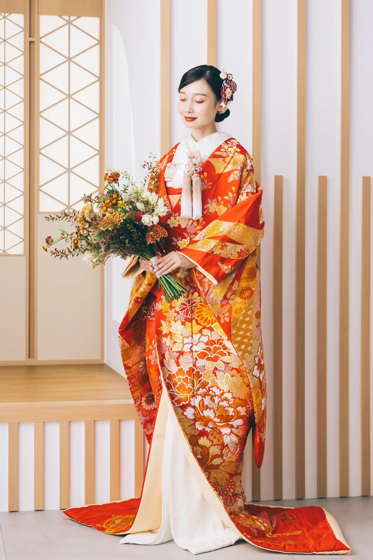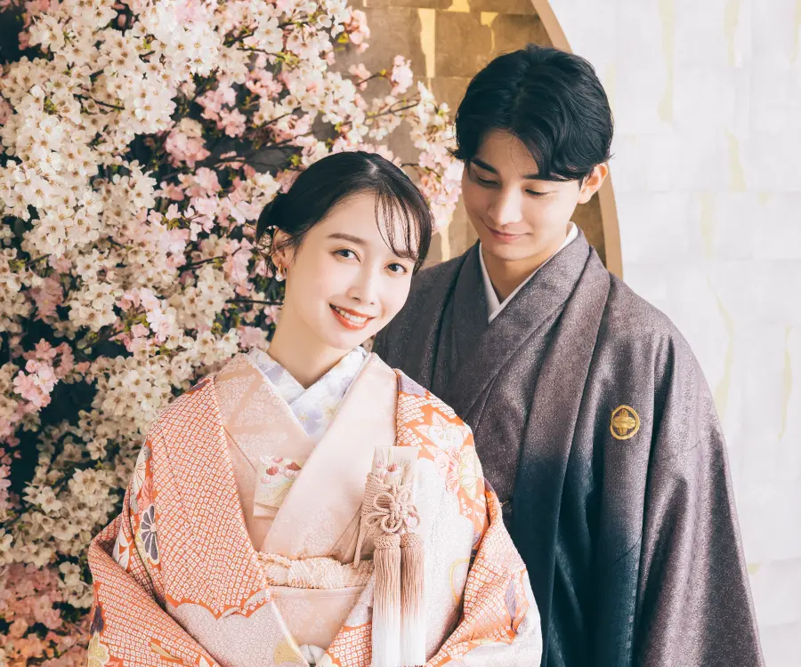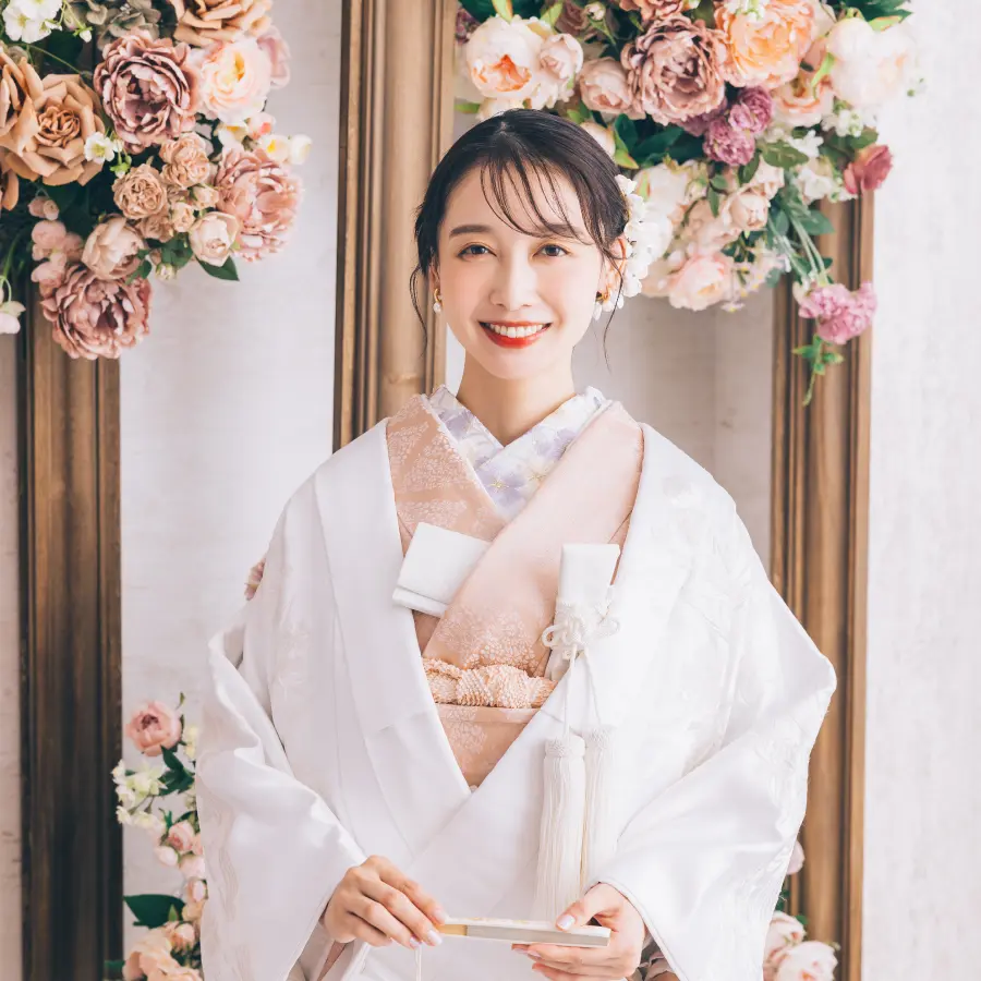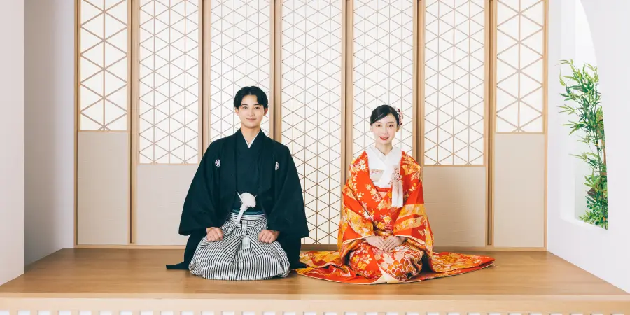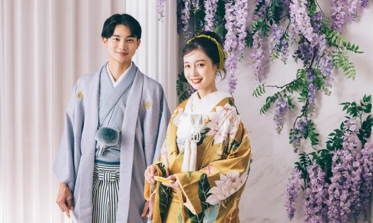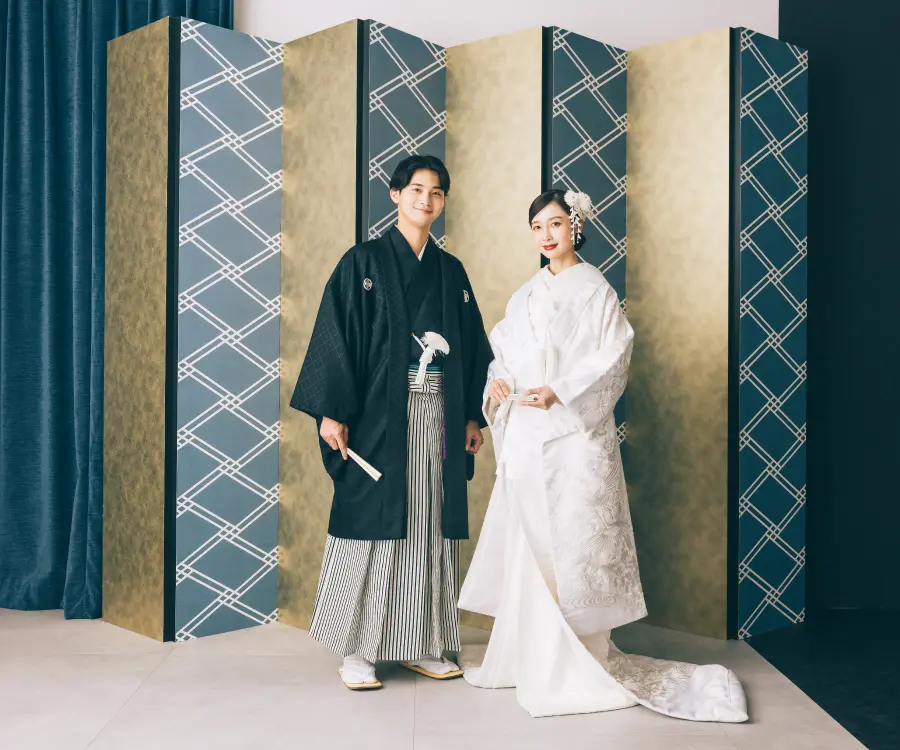 新婦は白無垢・色打掛・引き振袖、新郎は紋付袴を豊富な色柄の中から選べます。